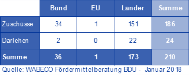 Im Januar 2018 gibt es in Deutschland 2.461 Förderprogramme, davon gelten 625 in NRW. Bundesweit sind 210 Förderprogramme für die Digitalisierung vorgesehen. Es werden dieses Jahr rund 170 Mrd. Euro an Unternehmen weitergereicht (vgl. Tabelle) Die Förderung der Digitalisierung für Unternehmen ist eine Mischung von Fördermitteln, die ohne Sicherheiten vergeben werden (rückzahlbare und nicht rückzahlbare) und solchen, die eine Haftungsentlastung für die Hausbank bieten. Dabei kann die Beratung, die Realisierung und die Pflege des digitalen Projektes bezuschusst und finanziert werden.