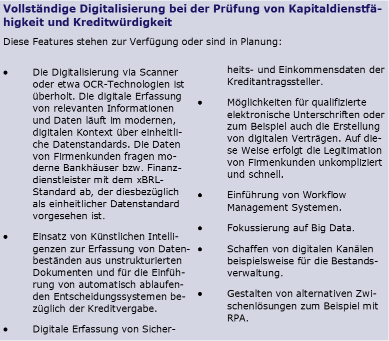 Gerade im Hinblick auf Finanzdienstleistungen haben sich zahlreiche neue Anbieter - insbesondere Fintech-Unternehmen - am Markt positioniert; weitere drängen bereits nach. Das Geschäftsmodell dieser Unternehmen konzentriert sich explizit auf die tatsächlichen Bedürfnisse von Kunden: Prozesse werden online abgewickelt, entsprechende Daten und Ressourcen sind sofort verfügbar und die Unternehmen haben stets schnell Zugriff auf einen bewilligten Kredit. Im Kreditgeschäft wird das besonders deutlich. Ob Kredite, Finanzierungen, Umschuldungsdarlehen oder zum Beispiel auch das Corporate-Kreditgeschäft - die umfassende Digitalisierung und die damit verbundene Automatisierung von bestimmten Standardprozessen weisen die Zukunft.